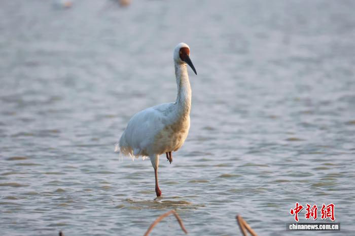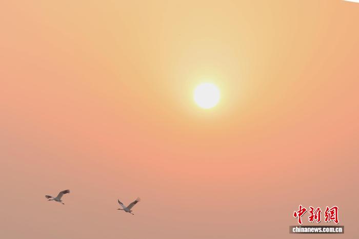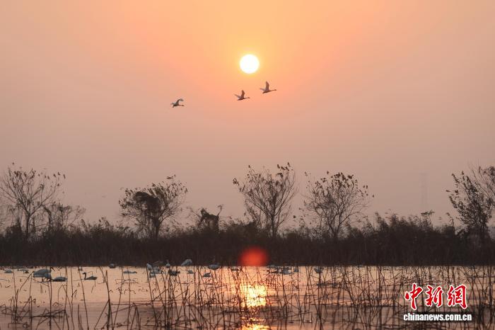 12月17日,正在鄱阳湖畔的江西省北昌市5星黑鹤珍爱小区,黑鹤、小天鹅、黑琵鹭等成群留鸟翔散于此。它们正在1处藕田栖身寻食,静享冬季温阳。图为旭日停或者翱翔或者休憩的留鸟。中新社记者 刘占昆 摄