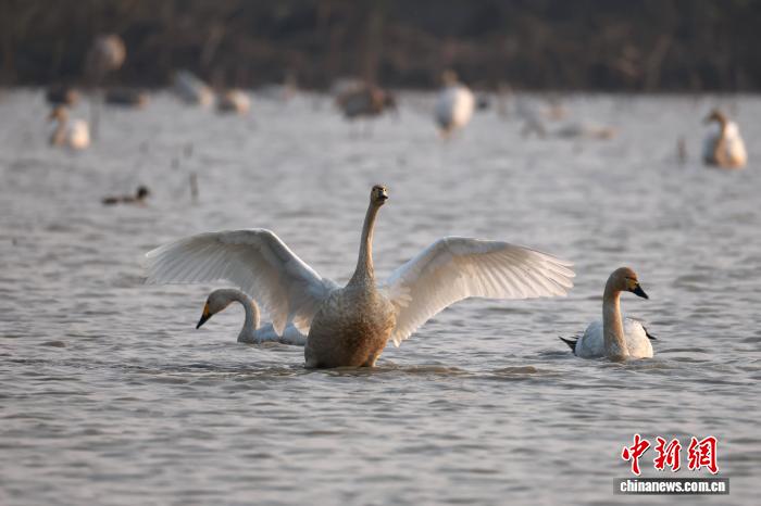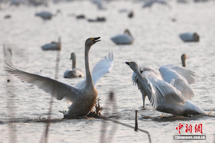 12月17日,正在鄱阳湖畔的江西省北昌市5星黑鹤珍爱小区,黑鹤、小天鹅、黑琵鹭等成群留鸟翔散于此。它们正在1处藕田歇息寻食,静享冬季温阳。图为火中玩耍的小天鹅。中新社记者 刘占昆 摄