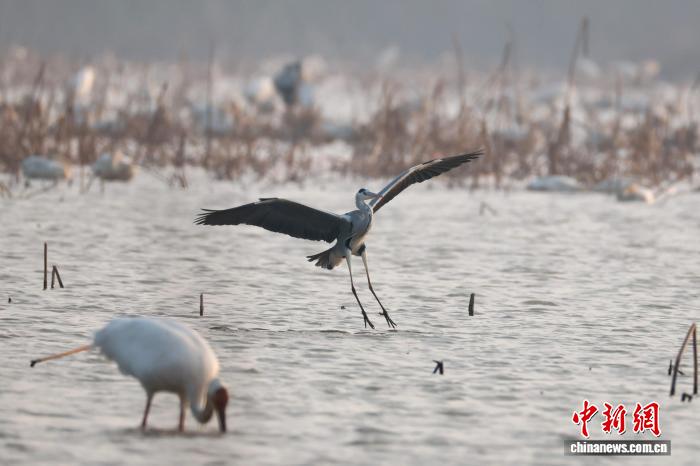 12月17日,正在鄱阳湖畔的江西省北昌市5星黑鹤珍爱小区,黑鹤、小天鹅、黑琵鹭等成群留鸟翔散于此。它们正在1处藕田休憩寻食,静享冬季温阳。图为翩翩起舞的苍鹭。中新社记者 刘占昆 摄